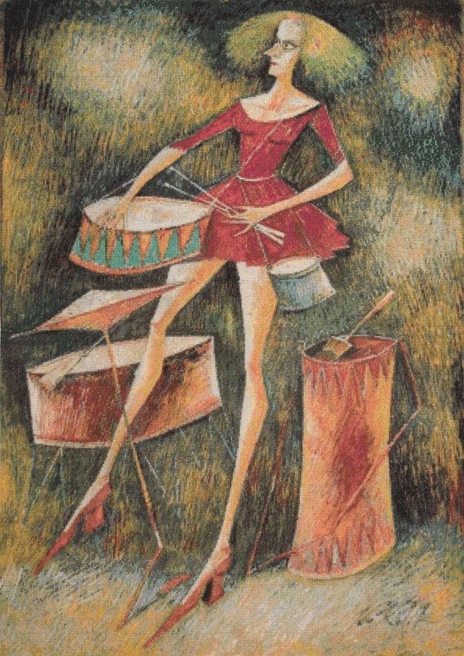 – Elżbieta Pacholczyk praca pt. „Perkusistka” miniatura obrazu malarza Iwana Kulika